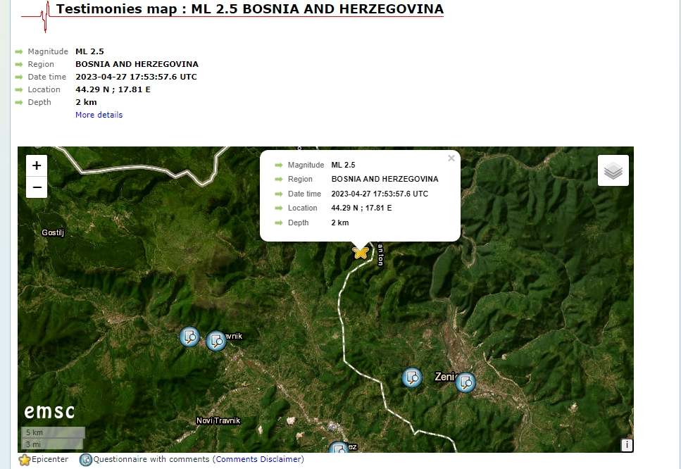 Prema podacima EMSC-a, epicentar je bio udaljen 12 km sjeverozapadno od Zenice te 66 km od Sarajeva.