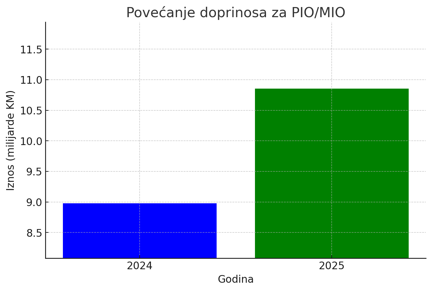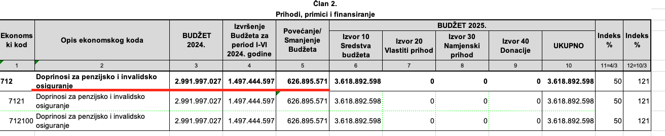 Prema usvojenom budžetu, u 2025. godini se očekuje prihod od 3,61 milijardi KM od doprinosa za PIO/MIO, dok je u 2024. prihod iznosio 2,99 milijardi KM. To znači da će prihodi od ovih doprinosa porasti za više od 620 miliona KM, što predstavlja povećanje od 20,9%., javlja Akta.ba.