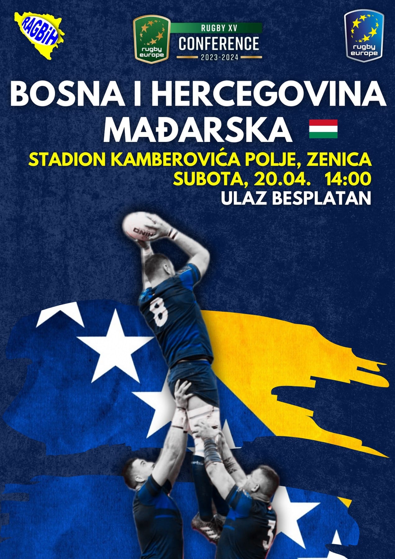 Ragbi reprezentacija Bosne i Hercegovine će sutra na stadionu Kamberovića polja dočekati reprezentaciju Mađarske u okviru posljednje utakmice grupne faze Europskog takmičenja u okviru Grupe B.