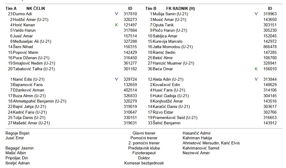 Poznat sastav Čelika i Radnika na Bilinom polju- Za 15 minuta igrači Čelika i Radnika odigrat će utakmicu 20. kola Prve lige Federacije BiH.