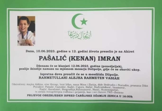 Dženaza 12-godišnjem Imranu Pašaliću, koji je poginuo jučer u saobraćajnoj nesreći kod Novog Travnika, biće klanjana sutra u Zenici, na mjesnom groblju Dolipolje, nakon ikindija namaza. Na istom mezarju biće obavljen i ukop.