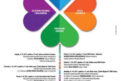 U subotu u 11 sati na Velikoj sceni BNP-a će biti odigrana predstava Dječijeg pozorišta Subotica „Ivica i Marica“ u režiji Todora Valova, a dan poslije, u nedjelju, u 11 sati će biti odigrana predstava „Prodani smijeh“ na Maloj sceni BNP-a, a u okviru programa Mali MESS.