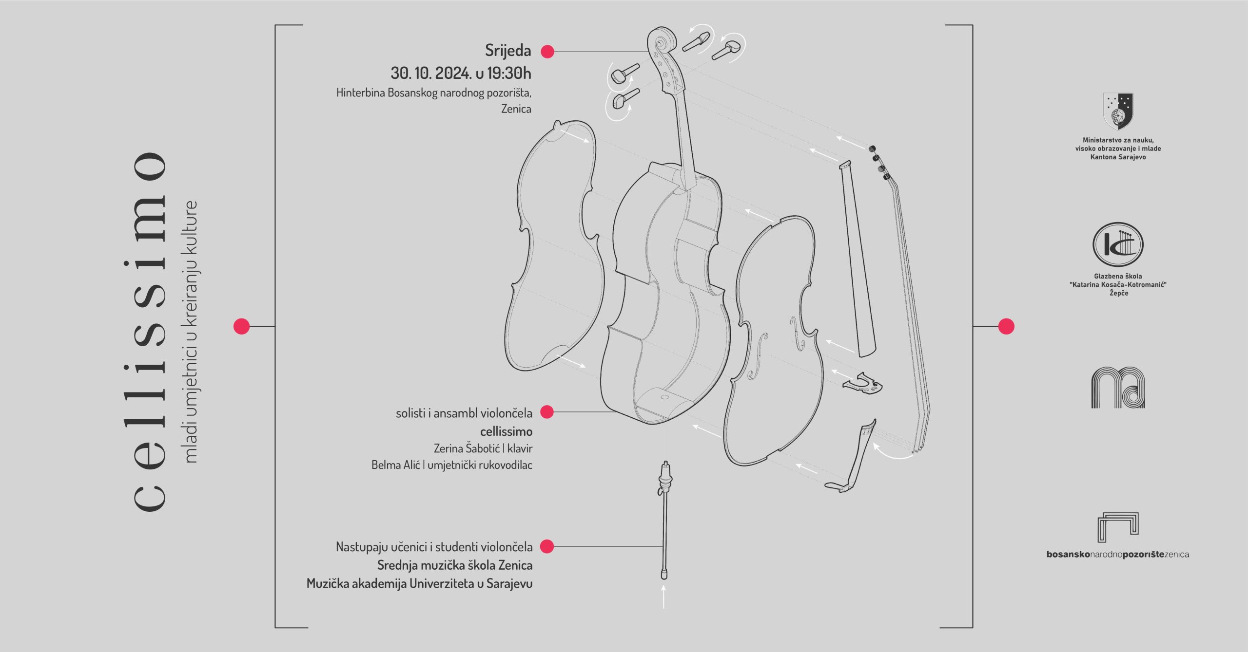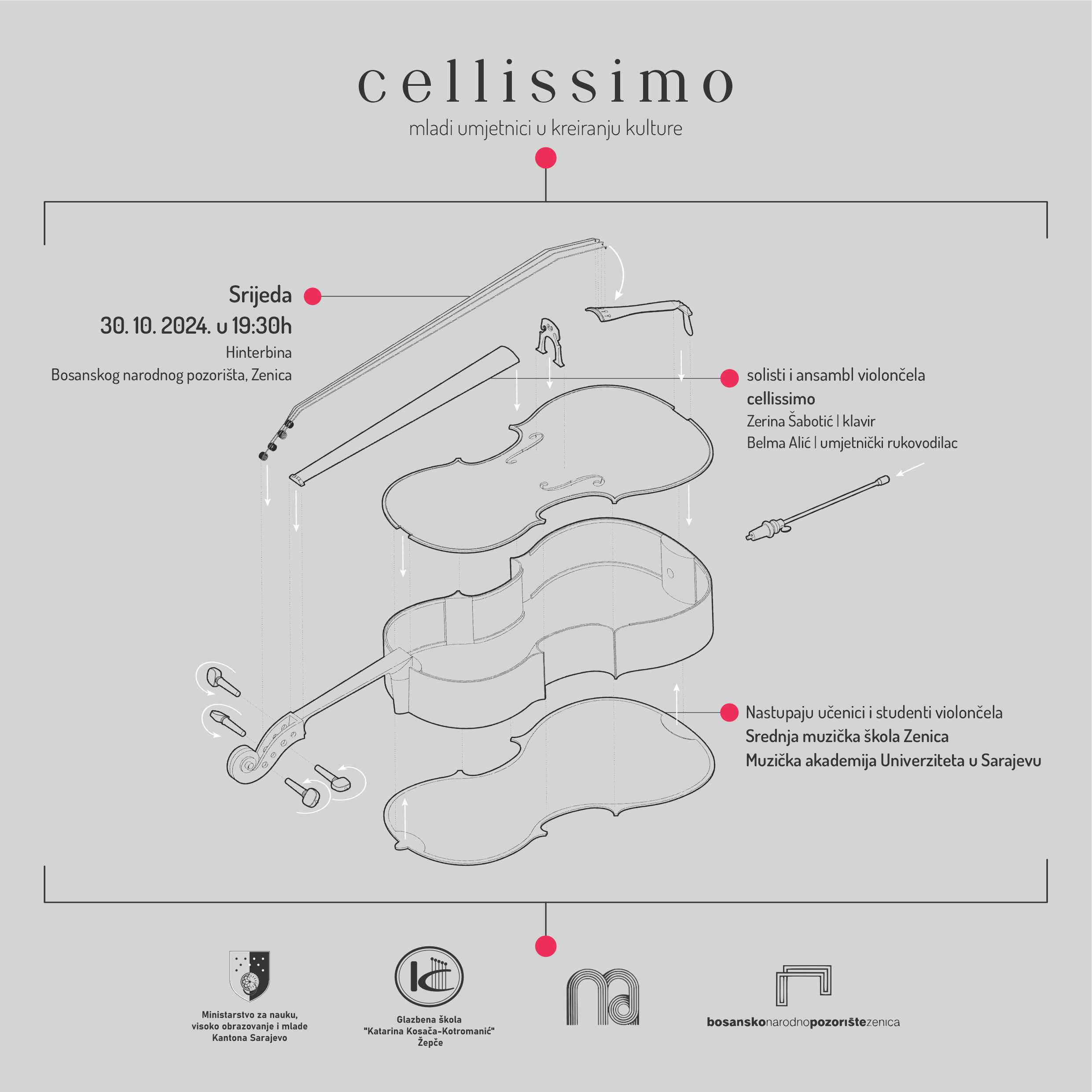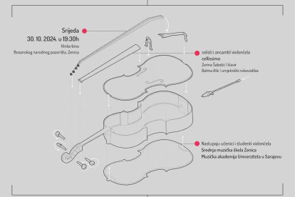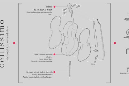Isti dan, u 19.30 sati na Hinter bini Bosanskog narodnog pozorišta Zenica u 19.30 sati bit će upriličen koncert „Cellissimo: Mladi umjetnici u kreiranju kulture“ Kamernog simfonijskog orkestra Zenica i Bosanskog narodnog pozorišta Zenica.