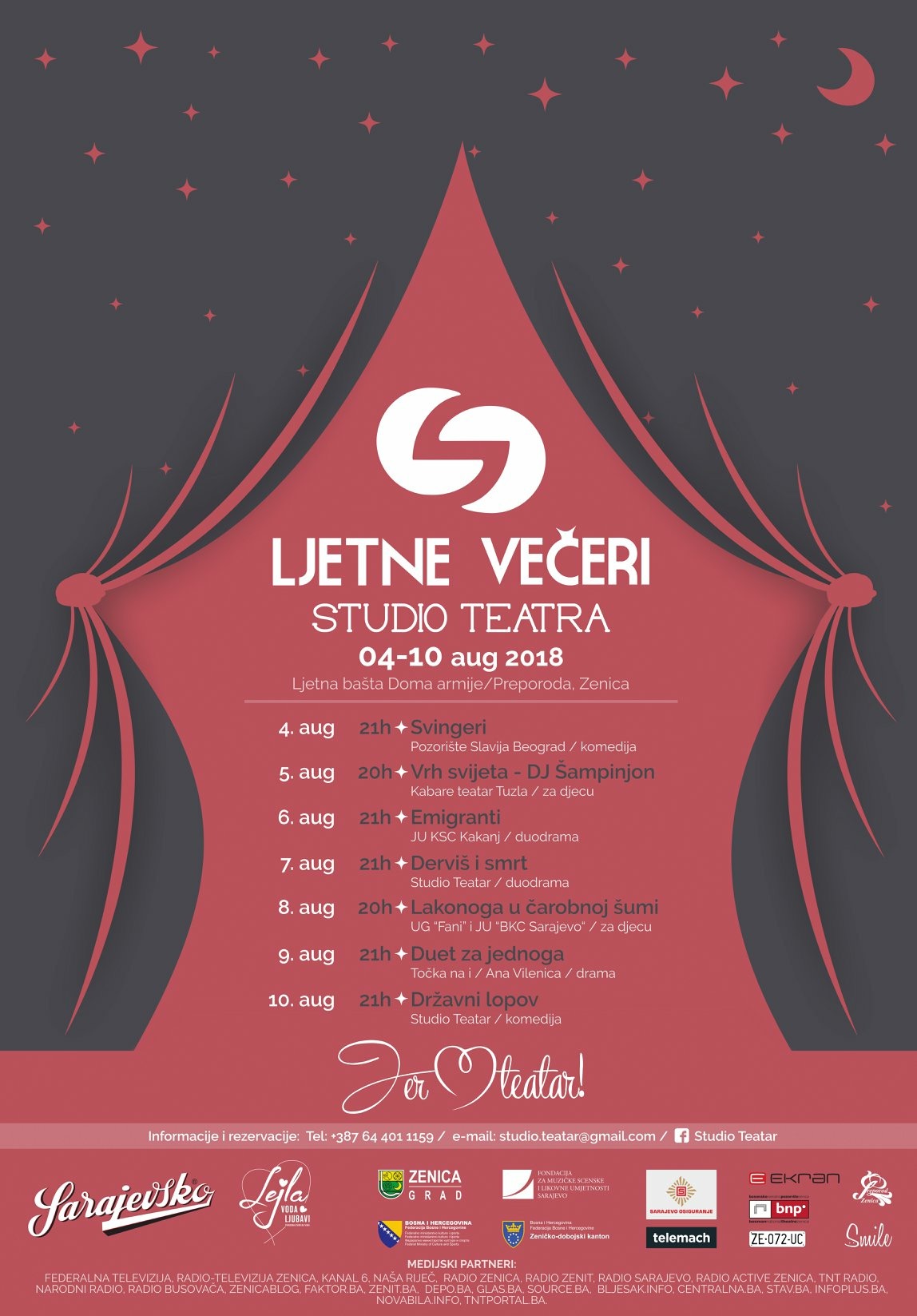 Festival završava jednom od najstarijih živućih predstava u BiH, hit komedijom “Državni lopov” u produkciji Studio Teatra. Predstave će igrati u terminima od 21:00 sat, osim predstava za djecu koje će igrati s početkom u 20:00 sati. Ulaznice za sve predstave je moguće kupiti u Clubu 072 u Zenici, kao i u Multiplex Ekranu u Zenici. Također, ulaznice će se moći kupiti i na Ljetnoj sceni Doma armije/Preporoda prije početka predstava. Cijene ulaznica su po 7,00 KM za predstave “Svingeri” i “Duet za jednog”, po 5,00 KM za predstave “Državni lopov”, “Derviš i smrt” i “Emigranti”, dok je cijena ulaznica za predstave za djecu po 4,00 KM.
