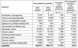 U odnosu na 2021. godinu, ukupan broj riješenih predmeta u 2022. godini je veći za 17.301 (4,5%). Povećanje je zabilježeno u svim Sudovima, osim u okružnim privrednim sudovima, Vrhovnom sudu Federacije BiH i neznatno na Apelacionom sudu Brčko distrikta BiH.
