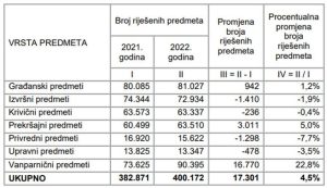 Rezultati su poređeni sa podacima za prethodnu 2021. godinu, a oni pokazuju da je ukupan broj neriješenih predmeta u 2022. smanjen za nešto više od 15 hiljada (15.346). Rast neriješenih predmeta je posebno rastao tokom pandemijske 2020. i 2021. godine, ali je u 2022. zabilježen pad neriješenih predmeta od 5%.