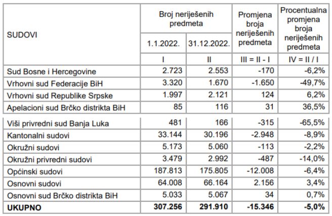 Procentualno, najveći pad broja neriješenih slučajeva zabilježen je na Višem privrednom sudu Banja Luka. On je sa 481 spao na 166, što je pad za 65%. Dobar rezultat je zabilježen i u Vrhovnom sudu Federacije BiH, koji je u 2022. godinu ušao sa 3.320 neriješena predmeta, a završio je sa 1.670. To je pad za gotovo 50%.