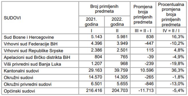 Najveće apsolutno smanjenje broja primljenih predmeta zabilježeno je u općinskim sudovima za 11.713 ili 5,4%, dok je u kantonalnim sudovima zabilježeno najveće apsolutno povećanje broja primljenih predmeta za 10.596 predmeta ili 36,3%. Ovo izuzetno veliko povećanje priliva predmeta tokom 2022. godine ostvareno je u jednom kantonalnom sudu – u Kantonalnom sudu u Mostaru.