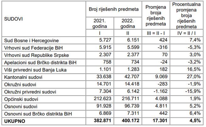 U odnosu na 2021. godinu, ukupan broj riješenih predmeta u 2022. godini je veći za 17.301 (4,5%). Povećanje je zabilježeno u svim Sudovima, osim u okružnim privrednim sudovima, Vrhovnom sudu Federacije BiH i neznatno na Apelacionom sudu Brčko distrikta BiH.