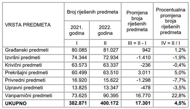 Rezultati su poređeni sa podacima za prethodnu 2021. godinu, a oni pokazuju da je ukupan broj neriješenih predmeta u 2022. smanjen za nešto više od 15 hiljada (15.346). Rast neriješenih predmeta je posebno rastao tokom pandemijske 2020. i 2021. godine, ali je u 2022. zabilježen pad neriješenih predmeta od 5%.