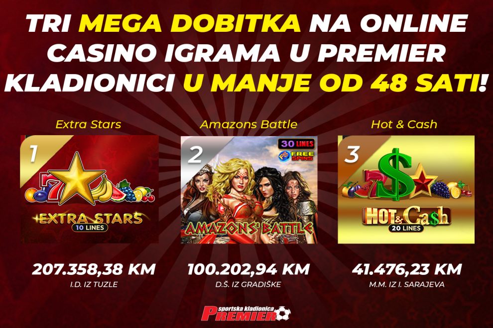 Premier kladionica sa svojim Jackpot dobitcima ponovno pomjera granice! U nešto više od mjesec dana izvučena su čak tri mega Jackpota na online casino igrama. Najprije je igrač R.H. iz Hadžića ostvario tada rekordni dobitak od 307.333,43 KM, da bi ga nedugo zatim s trona skinuo M.D. iz Tuzle s dobitkom od 326.963,59 KM. Jutros se sreća osmjehnula igračici I.D. iz Tuzle koja je osvojila Jackpot u iznosu od čak 207.358,38 KM.