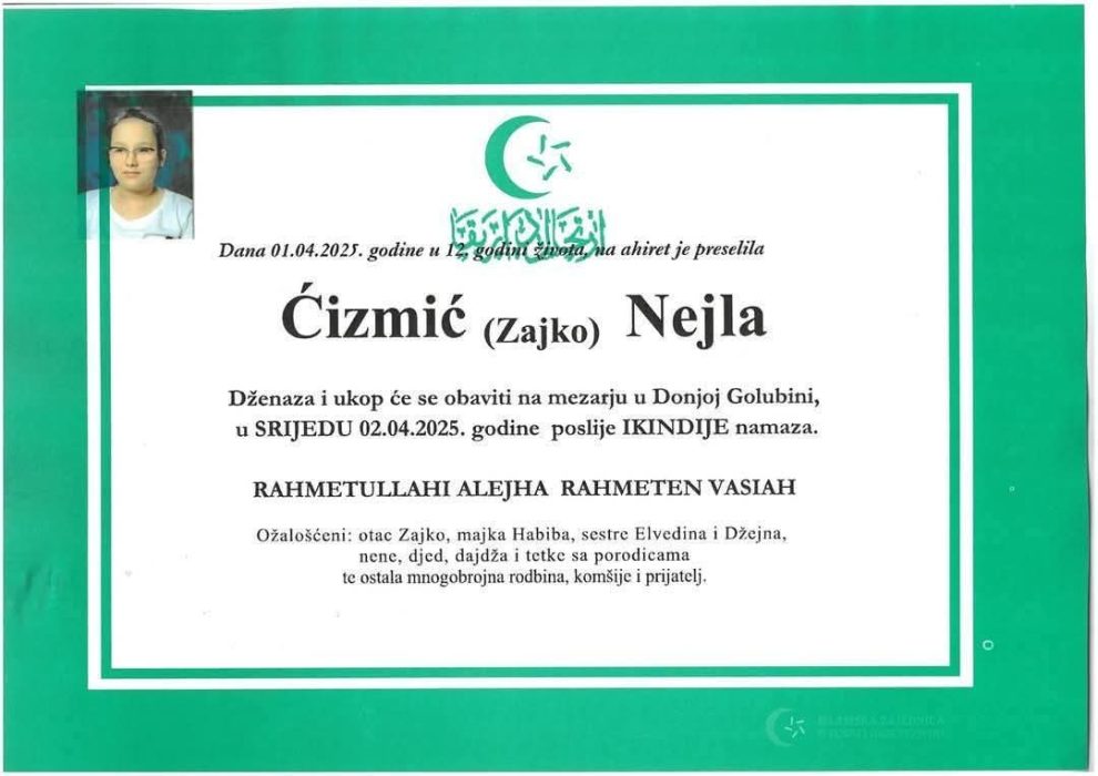 Preminula djevojčica Nejla Čizmić nakon dugogodišnje borbe s bolestima- Nejla Čizmić, djevojčica iz Žepča čija je životna borba inspirisala mnoge, preminula je nakon dugogodišnje bitke sa teškim zdravstvenim problemima.