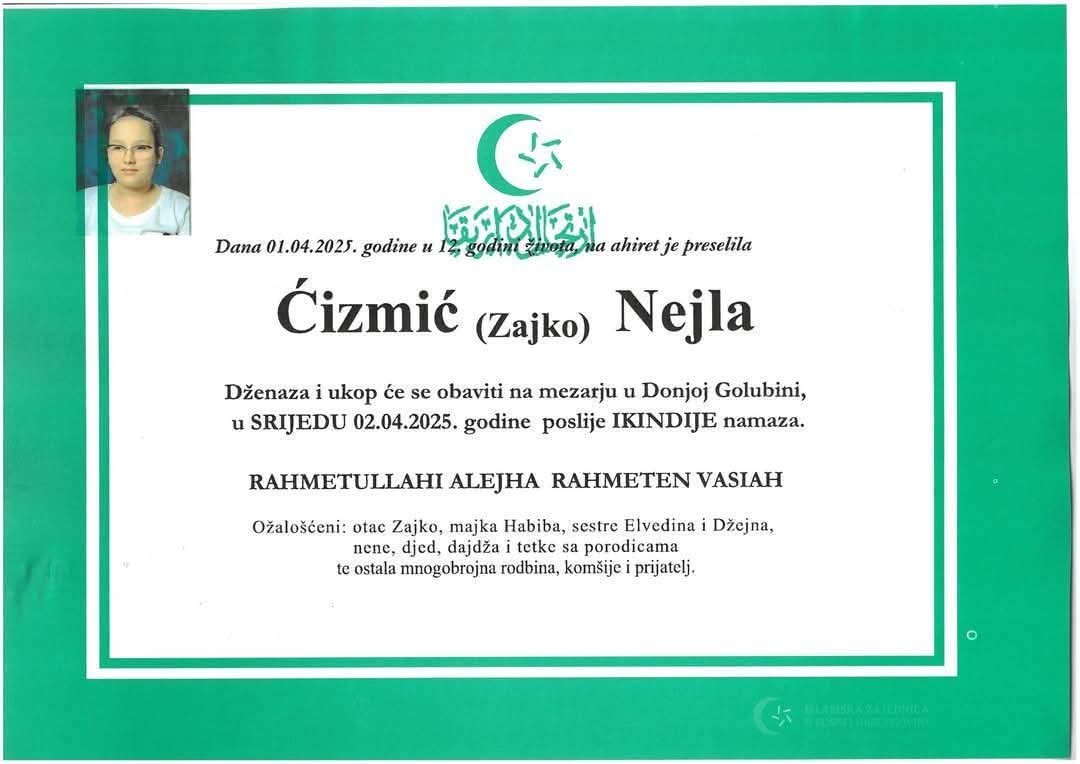Dženaza namaz i ukop će se obaviti na mezarju u Donjoj Golubinji u srijedu 2. aprila poslije ikindije namaza.