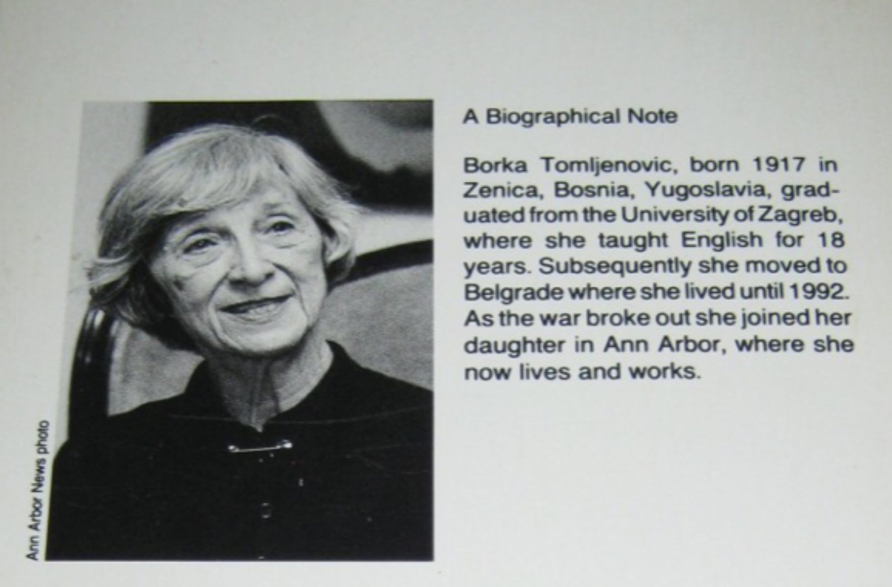 Born on October 4, 1917 in Zenica, Bosnia to a Serbian Orthodox couple as World War I raged and October revolution in Russia gave birth to communism, she spent childhood in Tuzla absorbing the melting pot of Serbs, Croats, Muslims, Jews, gypsies and others that Bosnia had become, and was convinced that very different groups can and must live peaceably together. Her father was one of Bosnia’s first surgeons trained in Vienna and an X-ray pioneer; she treasured this parent and copied his handwashing habits and life of discipline ingrained by education in a Jesuit Gymnasium in Zenica, her entire life. She remembered her varied school friends and in old age would recite the names of those alive and dead. Her first memoir, Bosnian Counterpoint, in 1997 at age 77 recounted stories and events from Bosnia during those early years. She amplified these memories and testimonials in Remembrances of Vanished Yugoslavia: Part 1 Bosnia 1917-1941 published by Amazon in 2015 when she was 98. Education was vital, and she completed gymnasium studies followed by a bachelor’s degree at Belgrade University in English language and literature. Borka married Juraj Tomljenovi?, a Croat, in 1938. Their daughter, Katarina, was born in Tuzla in 1940.