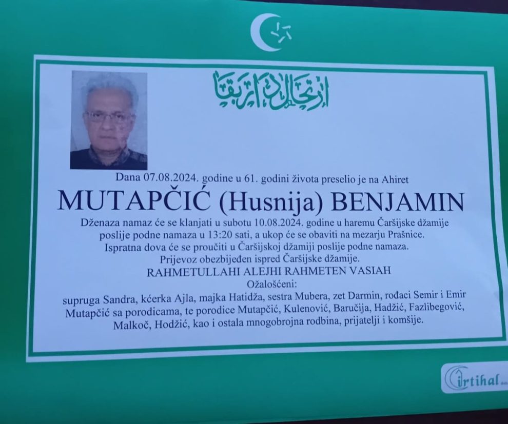 Preminuo Benjamin Mutapčić, sekretar Prve gimnazije Zenica: Poznat termin dženaze- Dugogodišnji sekretar Prve gimnazije u Zenici, Benjamin Mutapčić, umro je 7. augusta u 61. godini.