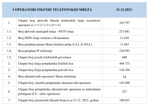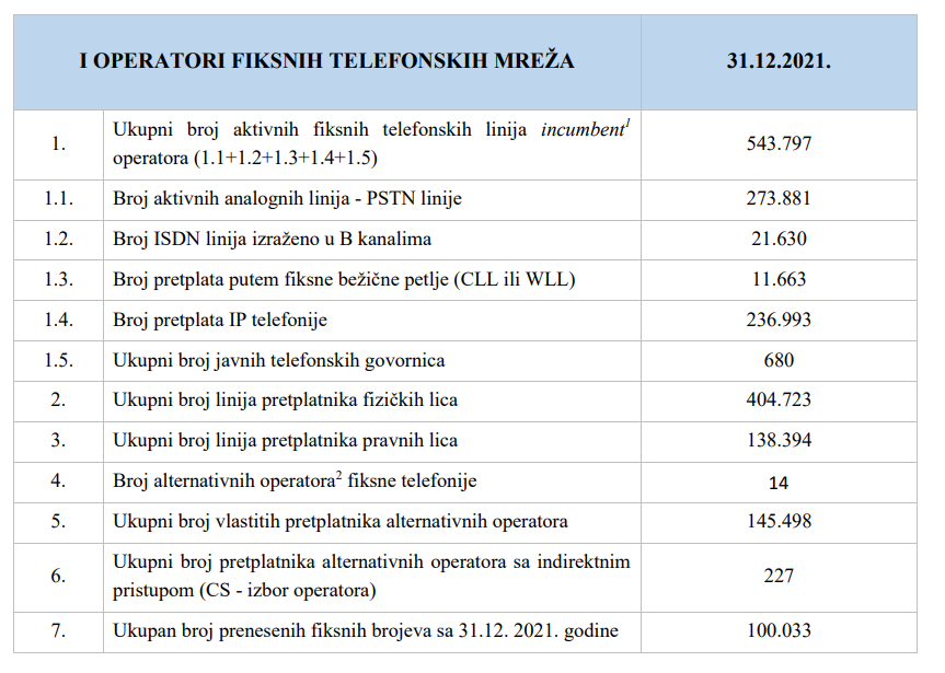 Ukupni broj aktivnih fiksnih telefonskih linija incumbent operatora je 543.797 i u odnosu na 2020. je u padu kada ih je bilo 560.796.