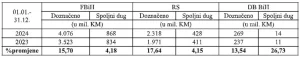 U tablici ispod dajemo prikaz ukupno raspoređenih sredstava entitetima i Distriktu Brčko BiH sa pripadajućim spoljnim dugom u periodu januar-decembar 2024. godine u poređenju sa istim periodom prošle godine. Svi iznosi su iskazani u milionima KM.