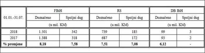Za finansiranje državnih institucija u periodu januar-juli 2018. godine raspoređen je iznos od 432 miliona KM. Federaciji BiH ukupno je raspoređeno 1 milijardu i 931 milion KM, Republici Srpskoj 982 miliona KM i Brčko distriktu 105 miliona KM.
