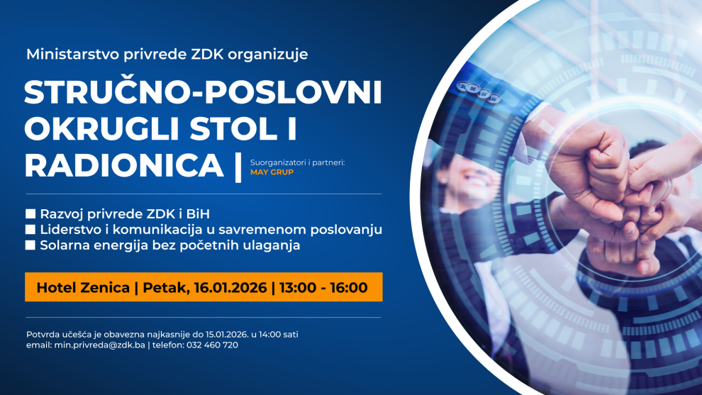 Ministarstvo za privredu Zeničko-dobojskog kantona organizuje stručno-poslovni okrugli sto i radionicu namijenjene vlasnicima, direktorima i menadžerima preduzeća, s ciljem otvaranja konstruktivnog dijaloga između institucija i privrede te predstavljanja konkretnih i primjenjivih rješenja za unapređenje poslovanja.