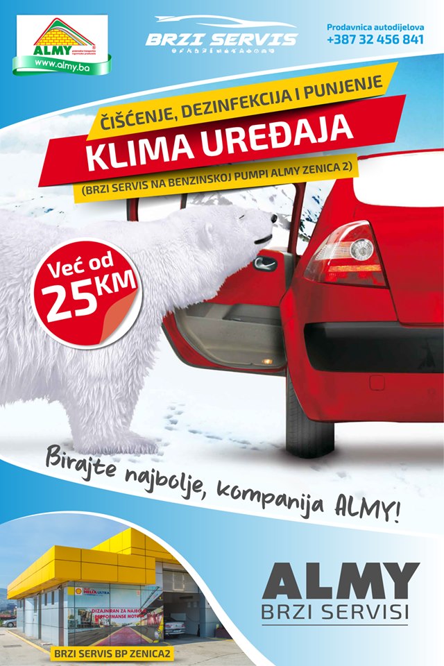 Pripremite se za ljetne vrućine – ćišćenje, dezinfekcija i punjenje auto klime – Dolazi nam ljeto i klima uređaj u Vašem automobilu će se svakodnevno koristiti. Ne dovedite se u situaciju da vam klima uređaj otkaže poslušnost. Pripremite svoje vozilo za vruće ljetne dane u ALMY BRZOM SERVISU u sklopu benzinske pumpe ALMY ZENICA 2.