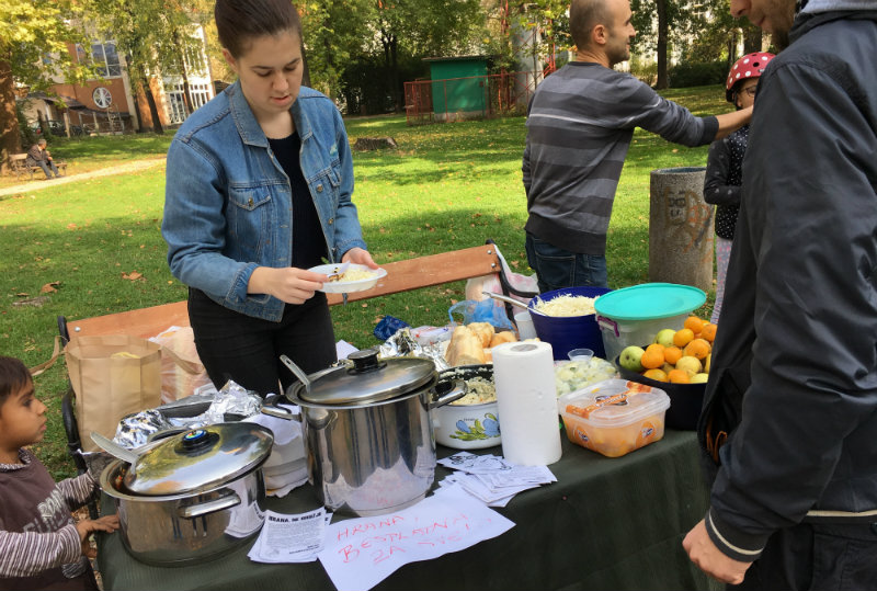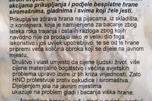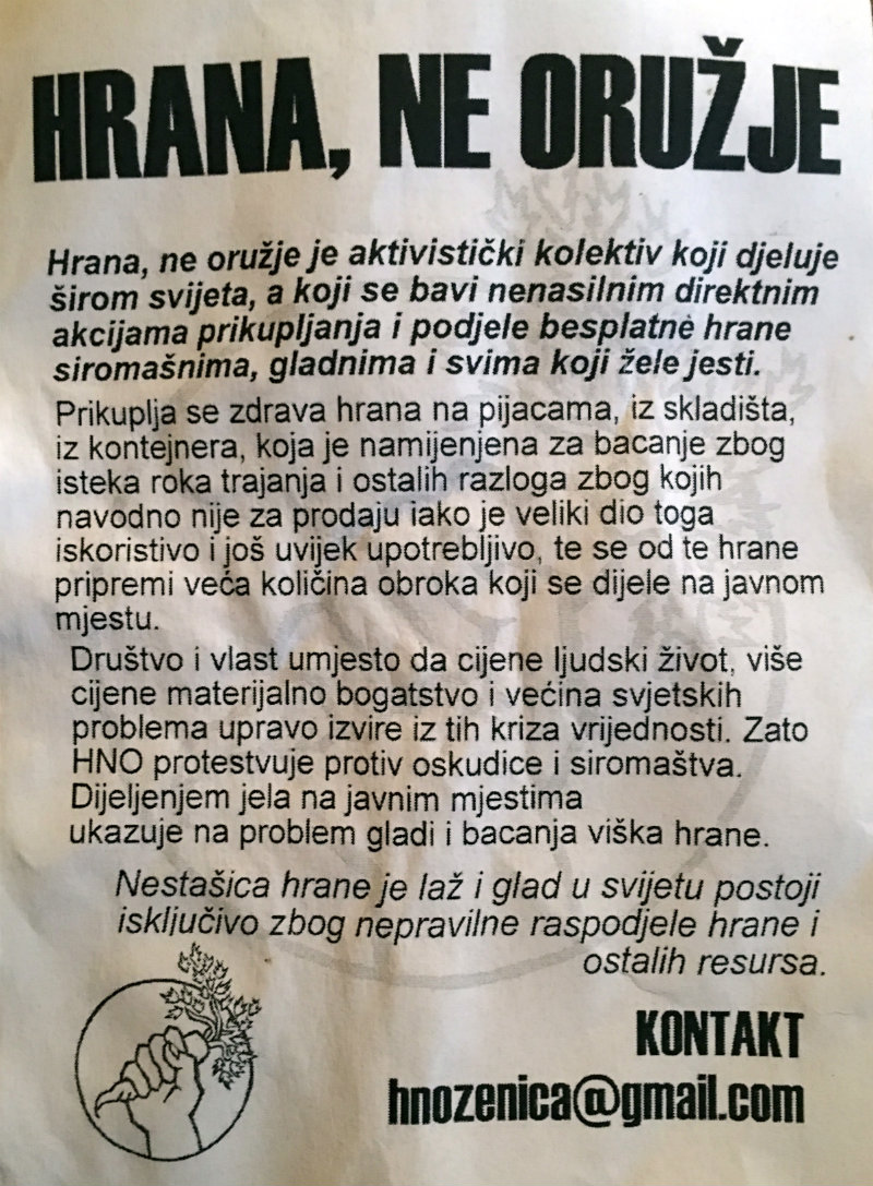 Akcija “Hrana, ne oružje” takođe nosi svoju poruku – da hranu ne moramo bacati i da ima puno gladnih u svijetu zbog nepravilne raspodjele i ostalih resursa. Oni naprave veću količinu obroka od hrane koju skupe na pijaci te je zatim dijele javno svima koji su gladni. I tu možete dobiti i ovakav letak sa porukom akcije.