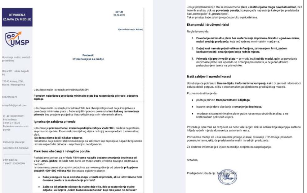 Udruženje najavljuje pokretanje šire medijske i informativne kampanje s ciljem da javnost i donosioci odluka dobiju „potpunu sliku o ekonomskim posljedicama sada predloženog modela povećanja minimalne plate“.