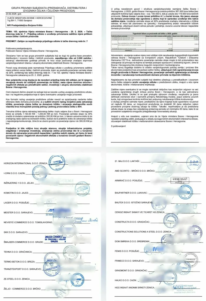 Grupa firmi koje se godinama bave preradom, distribucijom i izvozom čelika uputila je dopis na adresu Vijeće ministara Bosne i Hercegovine, na ruke predsjedavajuće Borjana Krišto, povodom Prijedloga odluke o uvođenju privremene zaštitne mjere pri uvozu čelika i čeličnih proizvoda.