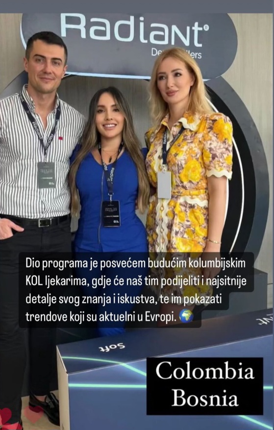 Ministrica zdravstva Zeničko – dobojskog kantona, dr. Aida Salčinović (POKRET) boravila je u Kolumbiji, gdje je u svojstvu edukatora, u gradovima Bogota, Cali i Medelin učestvovala na tzv. hands-on radionicama. Kao jedan od najcjenjenijih doktora na polju estetske medicine u našoj zemlji i regionu, dr. Salčinović stručnjacima iz Kolumbije i drugih država Južne Amerike imala je priliku prezentirati kliničke studije i SLO-HA tehnologiju kreiranja RadiaNt filera.
