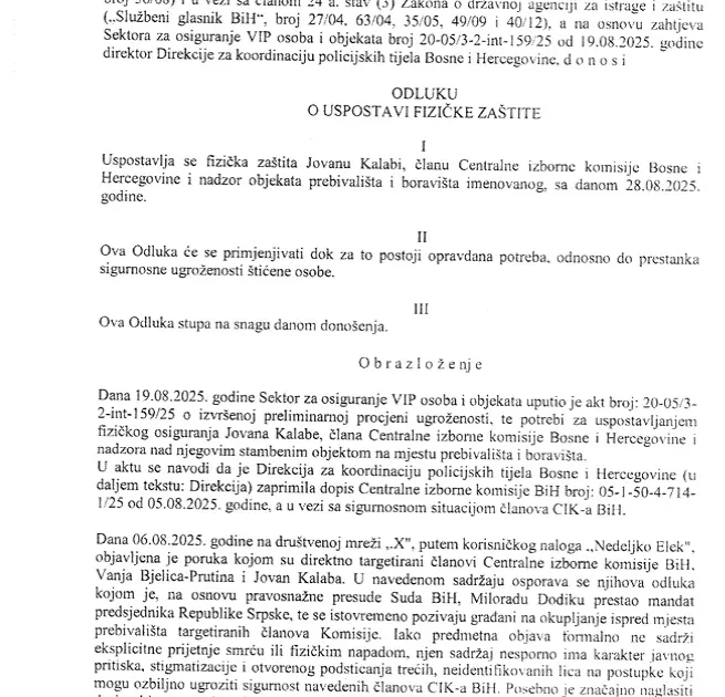 Jovan Kalaba je prije nekoliko dana izabran za novog predsjednika Centralne izborne komisije (CIK) BiH. No, njemu je još 19. avgusta, kao članu CIK-a, DKPT dodijelio fizičku zaštitu.