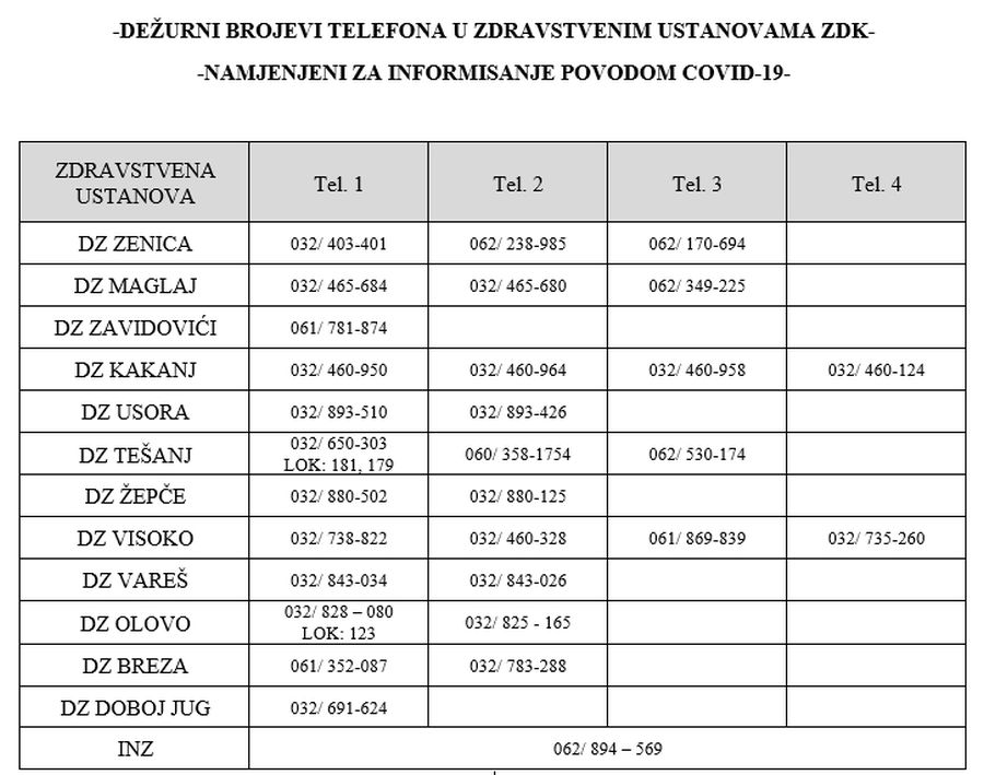 U nastavku su dati kontakt brojevi za informacije u vezi Covid-19 u svim domovima zdravlja na području ZDK, kao i broj u Institutu za zdravlje i sigurnost hrane Zenica.