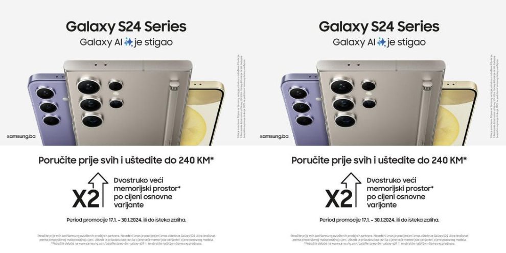 Budi među prvima u svijetu ponosni vlasnik nekog od Samsung Galaxy AI smartphone-a iz dolazeće S24 serije i bićeš nagrađen dvostruko većom memorijom od plaćene!