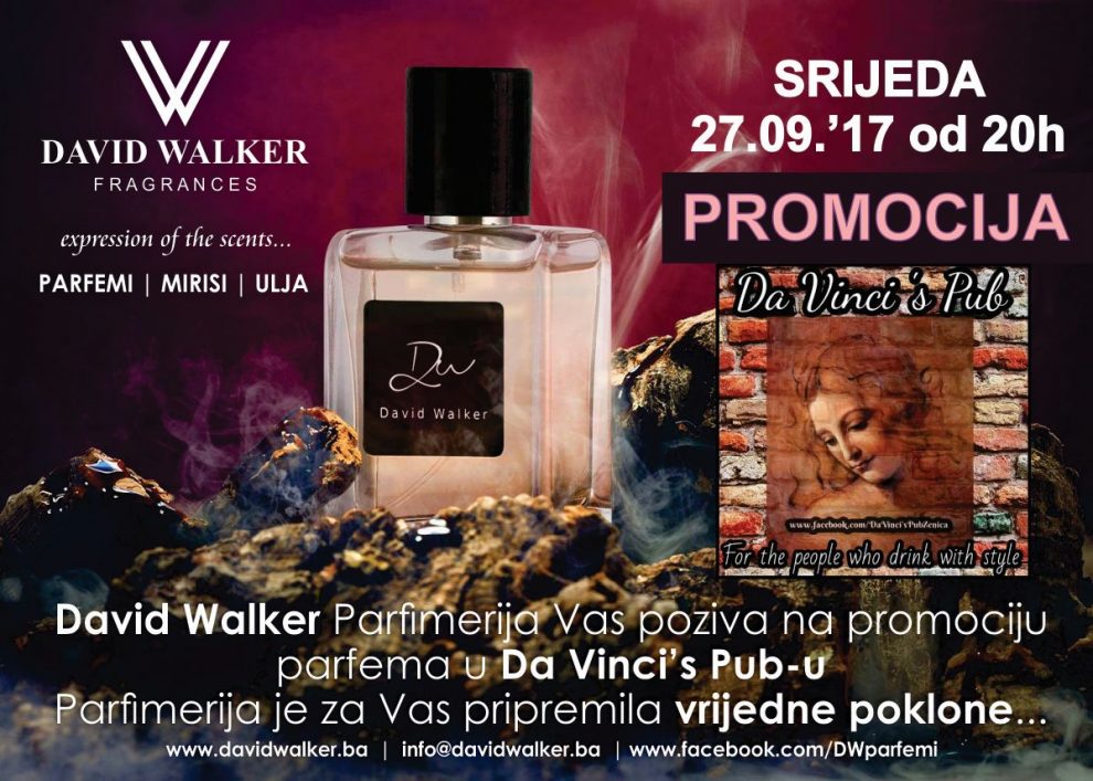 Promocija “DAVID WALKER” parfema u Da Vinci’s Pub-u – Ukoliko još niste imali priliku da se upoznate “David Walker Fragrances | Mirisi” – Parfimerija Vas poziva da u SRIJEDU 27.09.2017.g. od 20h dođete u Da Vinci’s Pub i uvjerite se u kvalitetu i posebnost mirisa naših proizvoda.