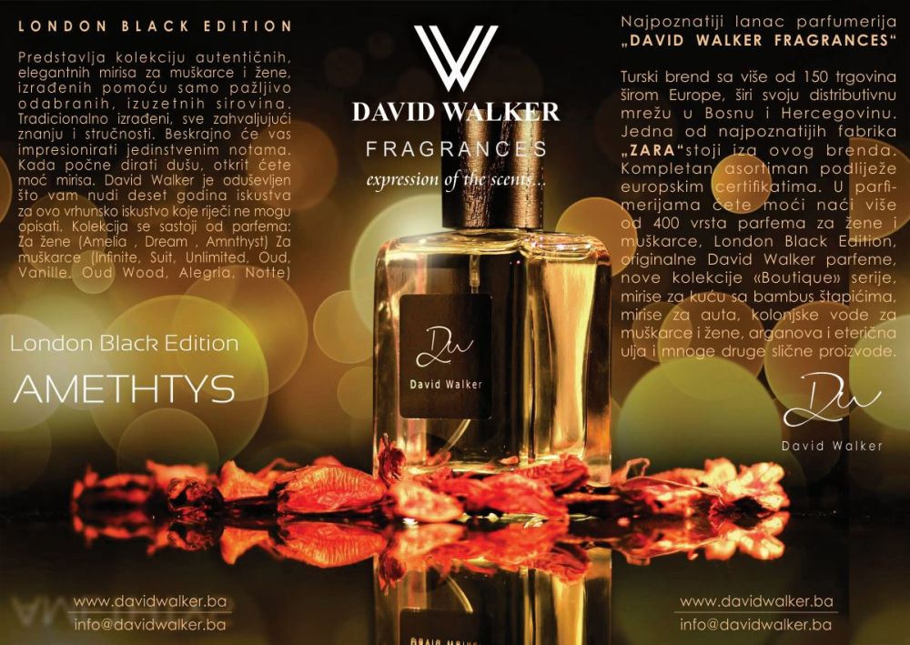 U parfimerijama ćete moći naći više od 400 vrsta parfema za žene i muškarce, London Black Edition, originalne David Walker parfeme, nove kolekcije «Boutique» serije, mirise za kuću sa bambus štapićima, mirise za auta, kolonjske vode za muškarce i žene, arganova i eterična ulja i mnoge druge slične proizvode.