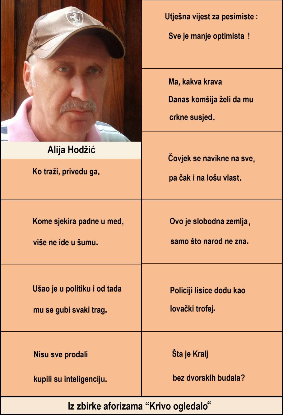 PROMOCIJA: Knjiga aforizama “Krivo ogledalo” Alije Hodžića – AFORIZMI KRIVO OGLEDALO – Izašla je iz štampe knjiga aforizama „Krivo ogledalo“ autora Alije Hodžića poznatog BiH humoriste iz Zenice. U svom dosadašnjem književnom stvaralaštvu bio je saradnik Nedeljku Opančiću u čuvenoj emisiji „ Cik Cak“ na Radio Sarajevu .