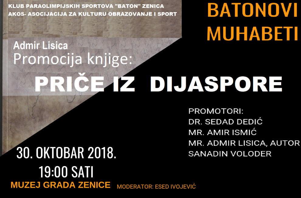 Promocija knjige: BATON – “Priče iz dijaspore” 30. oktobar 19h – U CILJU RESOCIJALIZACIJE, EDUKACIJE, KULTURNE AFIRMACIJE TE ISTICANJA SVIH POZITIVNIH VRIJEDNOSTI NAŠE DOMOVINE BOSNE I HERCEGOVINE.