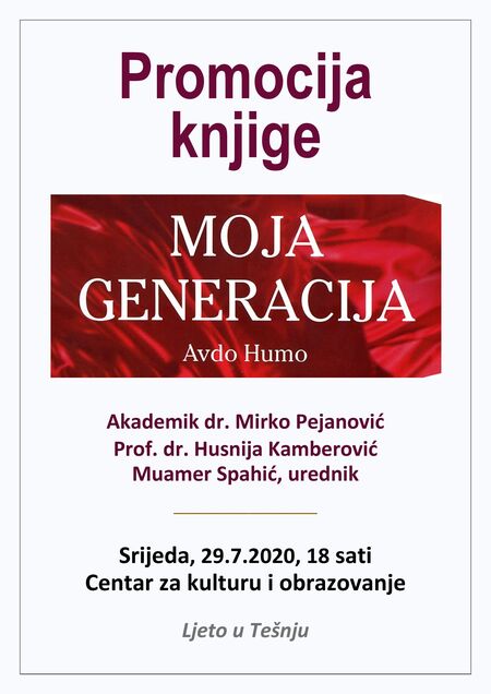 Promocija knjige “Moja generacija” Avde Hume – Centar za kulturu i obrazovanje, u okviru manifestacije Ljeto u Tešnju, organizira promociju knjige „Moja generacija“ autora Avde Hume. Riječ je o novom izdanju posthumno objavljenim Huminim sjećanja na jednu generaciju revolucionara koja se razvijala između dva svjetska rata i koja je vodila rat i revoluciju 1941-1945. godine. Humo na briljantan način opisuje međuratni Mostar, govori o svojoj porodici, svom školovanju i uključivanju u komunistički pokret, ilegalnom radu u Sarajevu 1941-1942. godine, ustanku, odnosu komunista i građanskih političara prve dvije godine rata ….