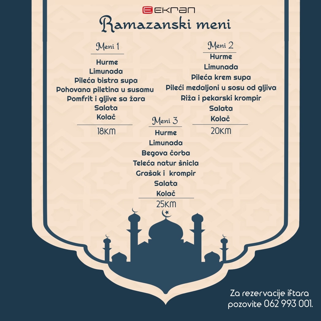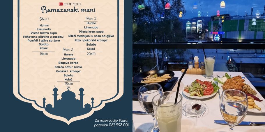 Iftarite sa svojim najmilijim u ugodnom ambijentu restorana Ekran sa pogledom na iskre ramazanskog topa. Za naše drage goste pripremili smo nekoliko prijedloga iftara. Za iftar je moguće naručiti i bilo koje drugo vama omiljeno jelo iz naše ponude.