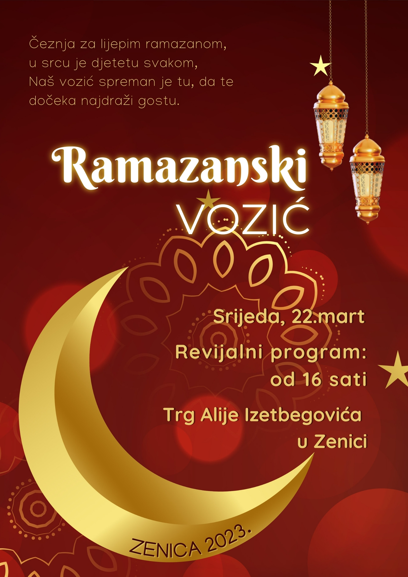 Ove godine, naš zajednički dan zakazujemo u srijedu, 22. marta 2023. godine, na Trgu Alije Izetbegovića u Zenici, te će kao i prethodnih godina, djeci koja se prijave i izvrše uplatu kotizacija biti obezbijeđeno mjesto u voziću sa helijum balonom, uz bogato pripremljen ramazanski paketić.