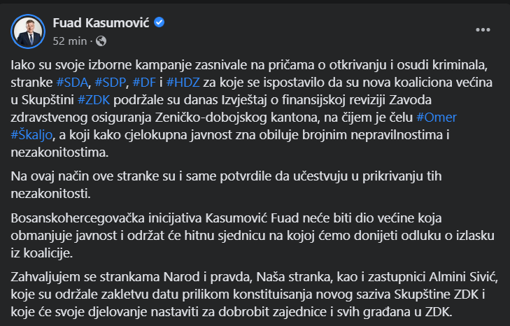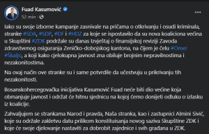 Nakon što je ovo izglasano na sjednici Skupštine ZDK, gradonačelnik Fuad Kasumović predsjednik BHI-KF oglasio se na svom Facebook profilu, a prenosimo objavu bez intervencija:
