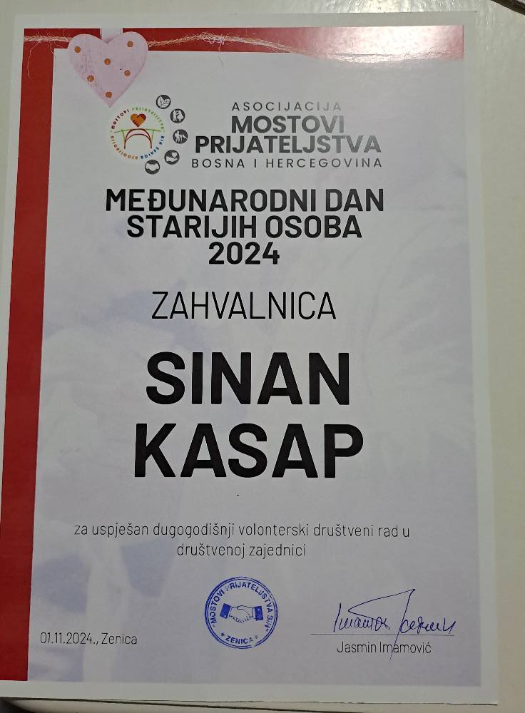 Organizovali smo i aktivnost organizacije svečane večere za osobe starije životne dobi na kojoj smo se lijepo držili sa njima. Tom prilikom smo uručili nekoliko zahvalnica i plaketa aktivnim osobama koje su iako u poznim godinama i dalje aktivni i volonterski doprinose svojoj zajednici. Na ovaj simboličan način smo željeli da se zahvalimo na aktivnostima koje i dalje realizuju i na taj način pokazuju da su nastavili raditi i djelovati u korist svoga komšiluka, udruženja, sportskog kolektiva ili šire društvene zajednice.