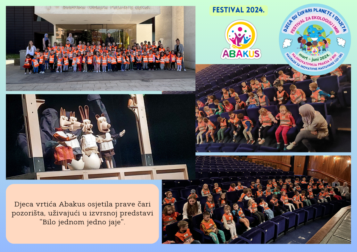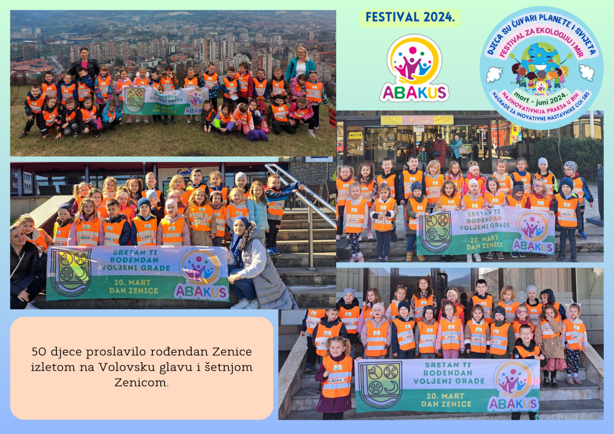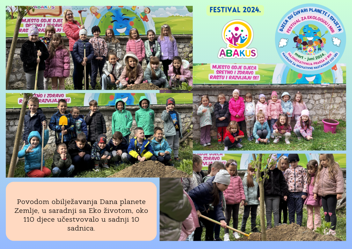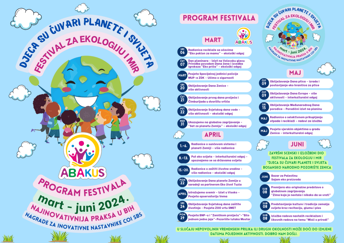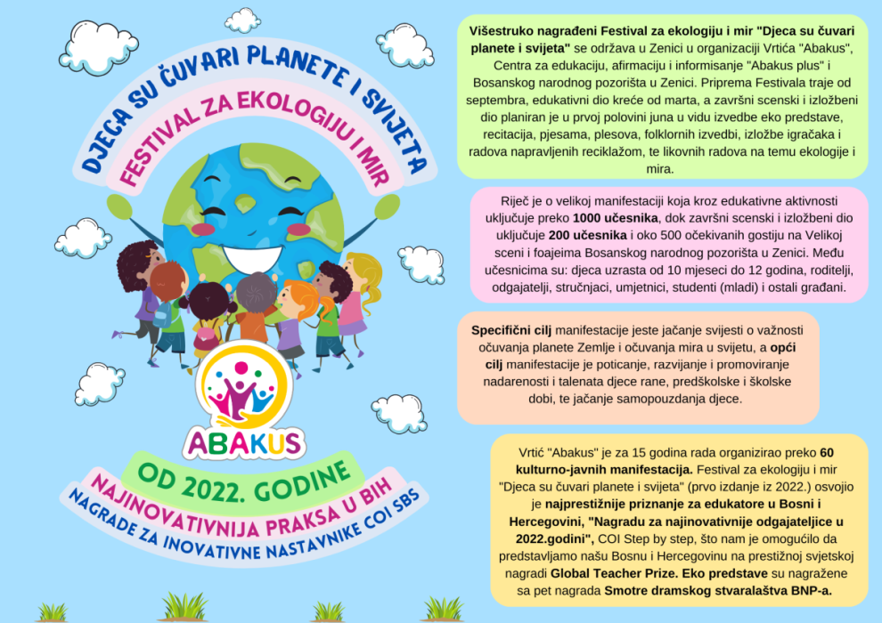 Višestruko nagrađeni Festival za ekologiju i mir “Djeca su čuvari planete i svijeta” se tri mjeseca održava u Zenici u organizaciji Vrtića “Abakus”, Centra za edukaciju, afirmaciju i informisanje “Abakus plus” i Bosanskog narodnog pozorišta u Zenici. Priprema Festivala traje od septembra, edukativni dio je počeo 6.3., a završni scenski i izložbeni dio planiran je 8.6. u vidu izvedbe eko predstave, recitacija, pjesama, plesova, folklornih izvedbi, izložbe igračaka i radova napravljenih reciklažom, te likovnih radova na temu ekologije i mira.