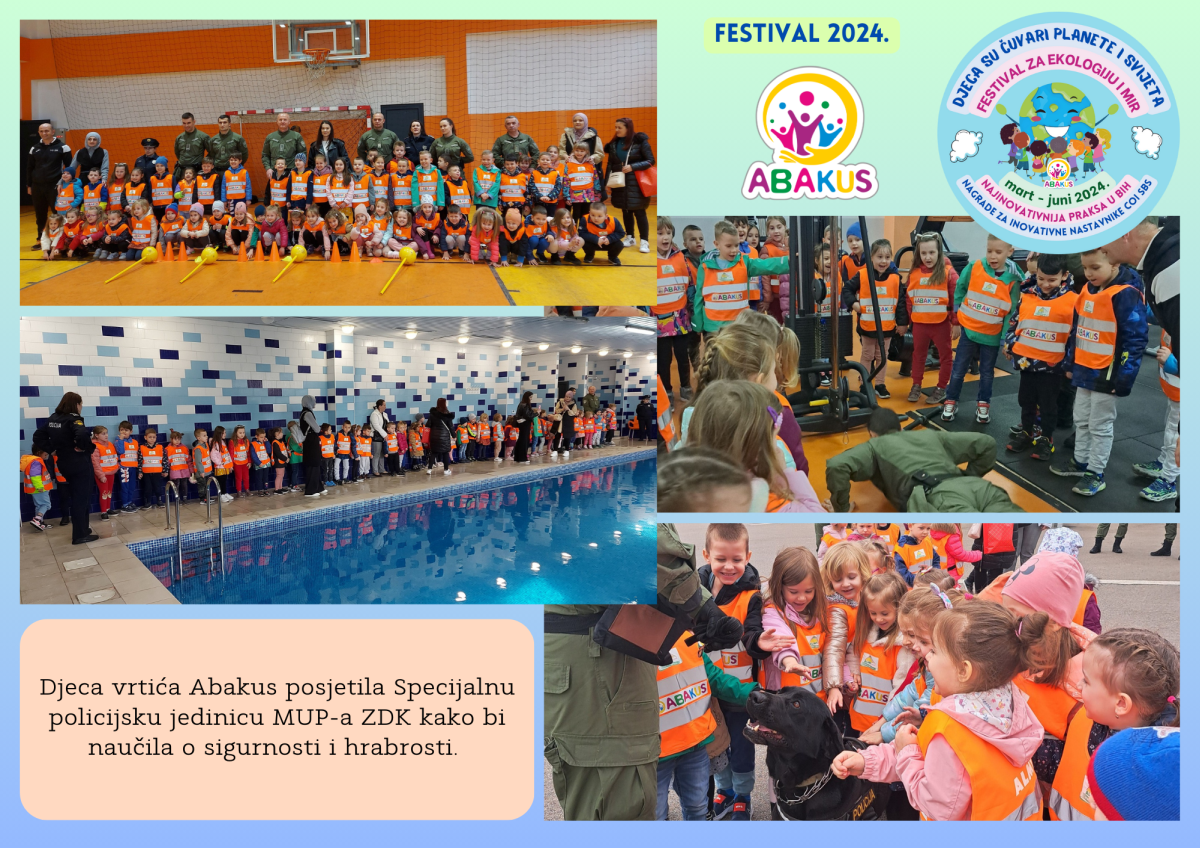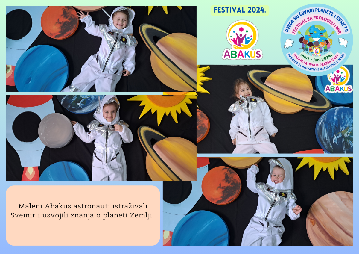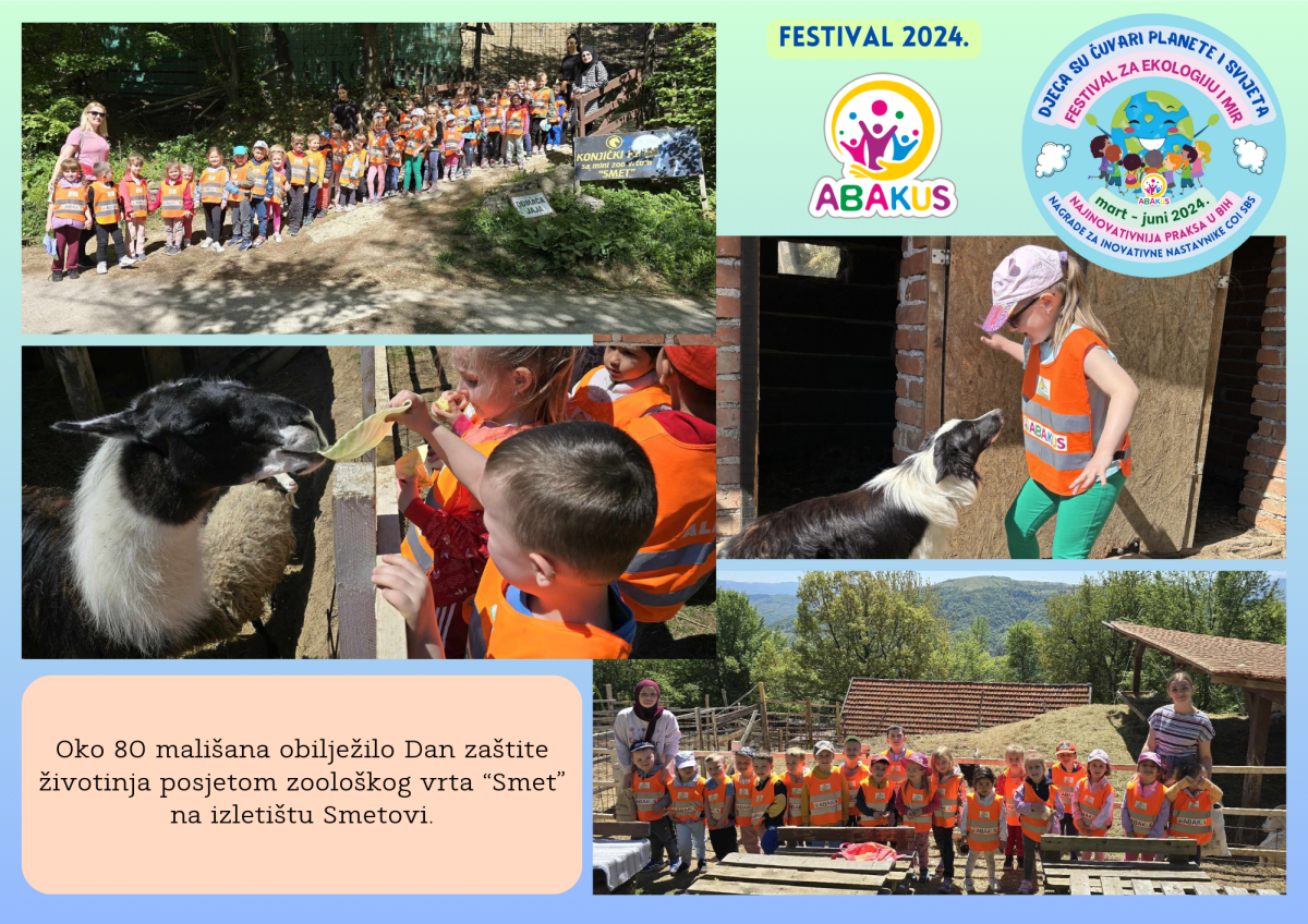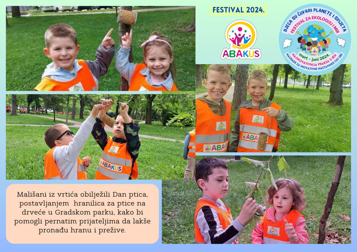 Višestruko nagrađeni Festival za ekologiju i mir “Djeca su čuvari planete i svijeta” se tri mjeseca održava u Zenici u organizaciji Vrtića “Abakus”, Centra za edukaciju, afirmaciju i informisanje “Abakus plus” i Bosanskog narodnog pozorišta u Zenici. Priprema Festivala traje od septembra, edukativni dio je počeo 6.3., a završni scenski i izložbeni dio planiran je 8.6. u vidu izvedbe eko predstave, recitacija, pjesama, plesova, folklornih izvedbi, izložbe igračaka i radova napravljenih reciklažom, te likovnih radova na temu ekologije i mira.