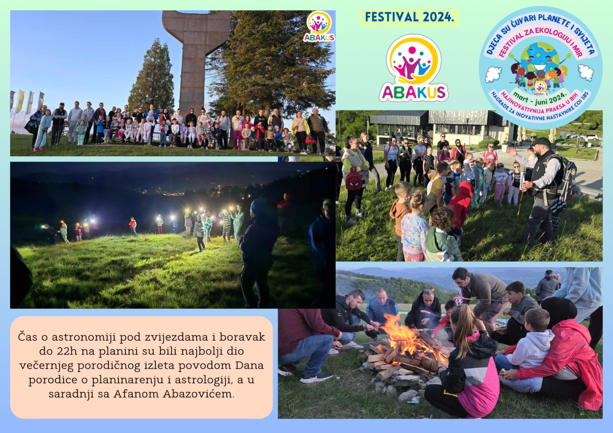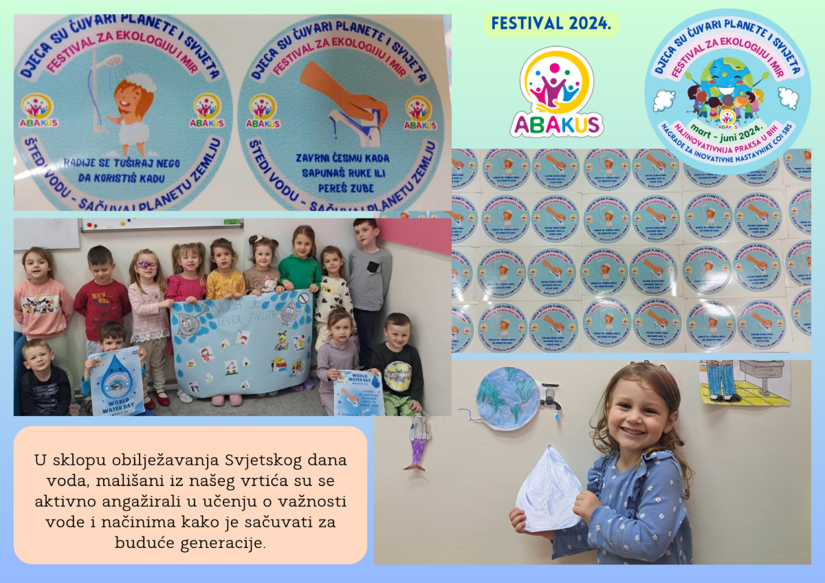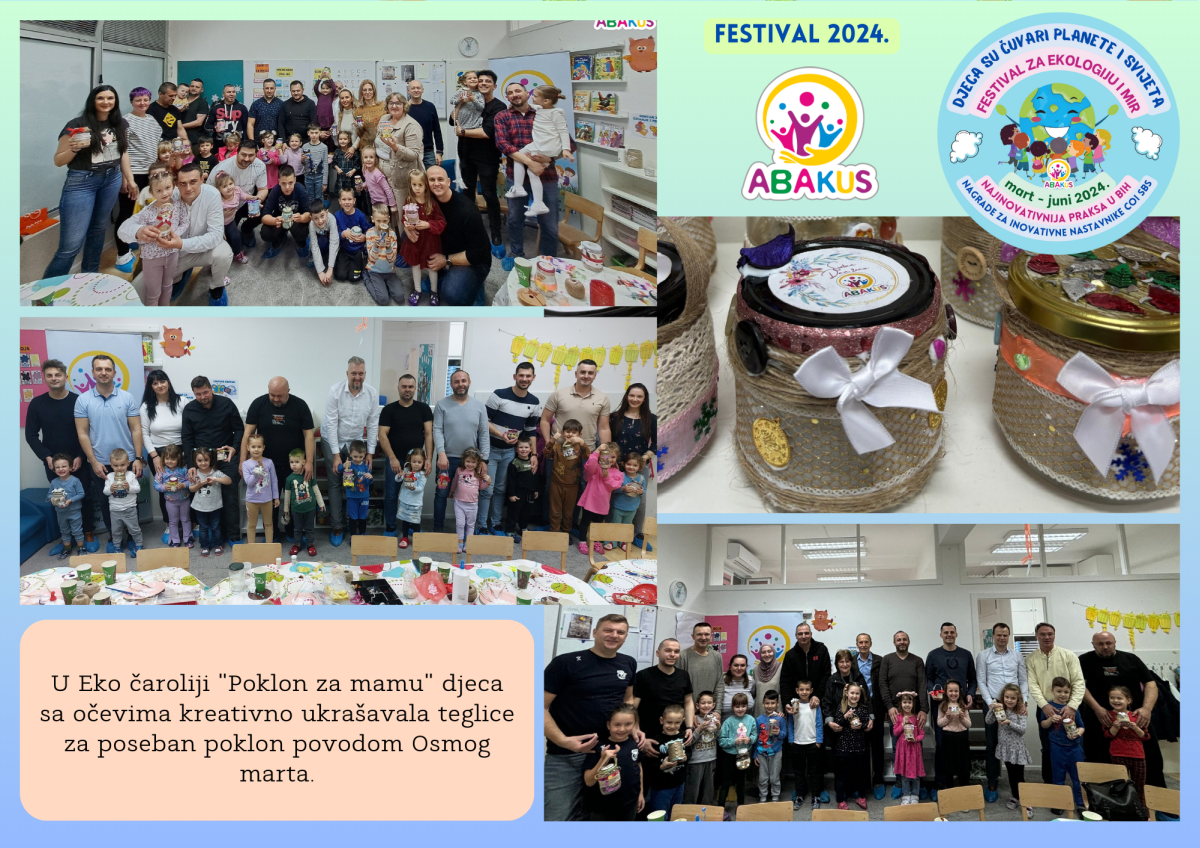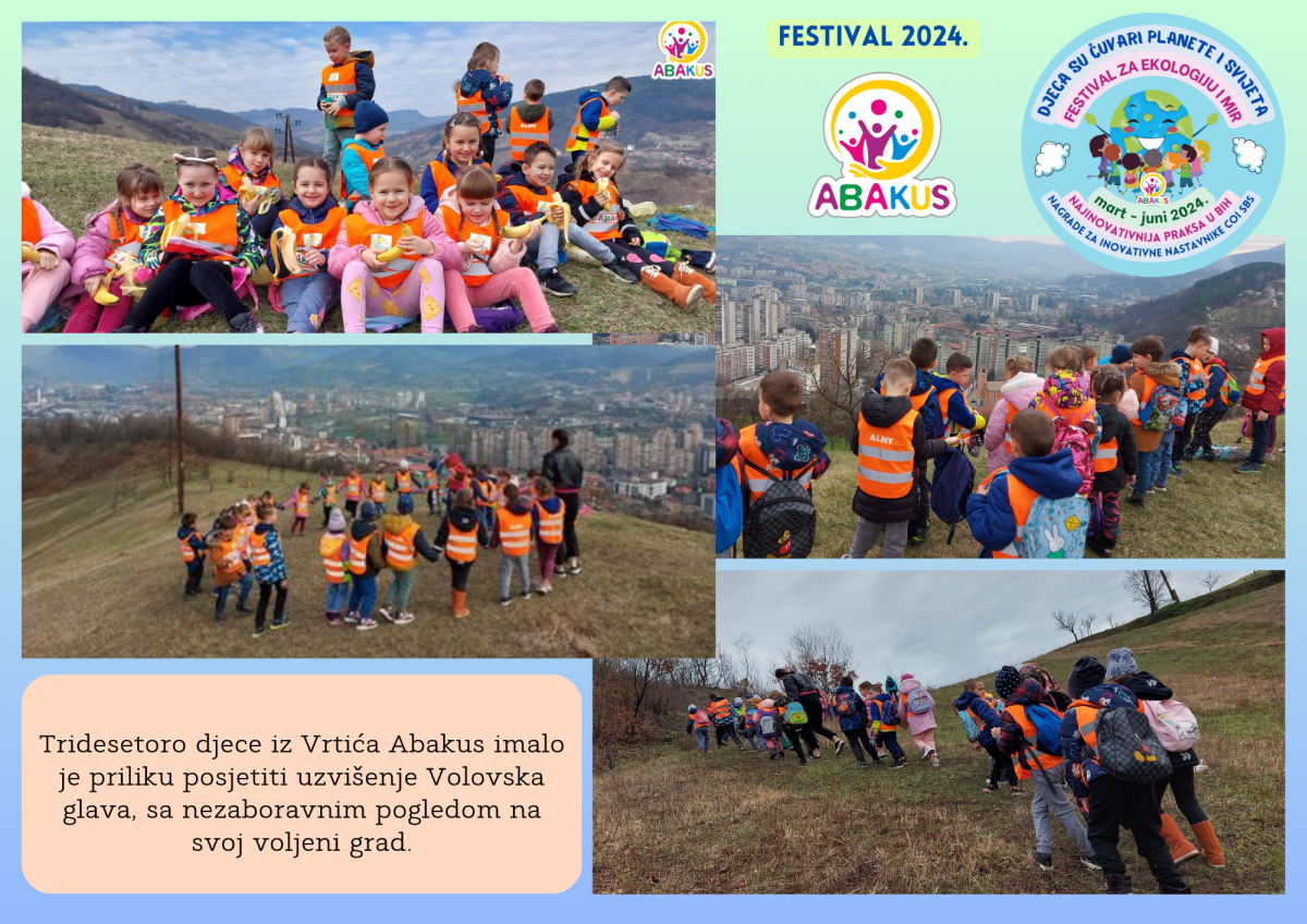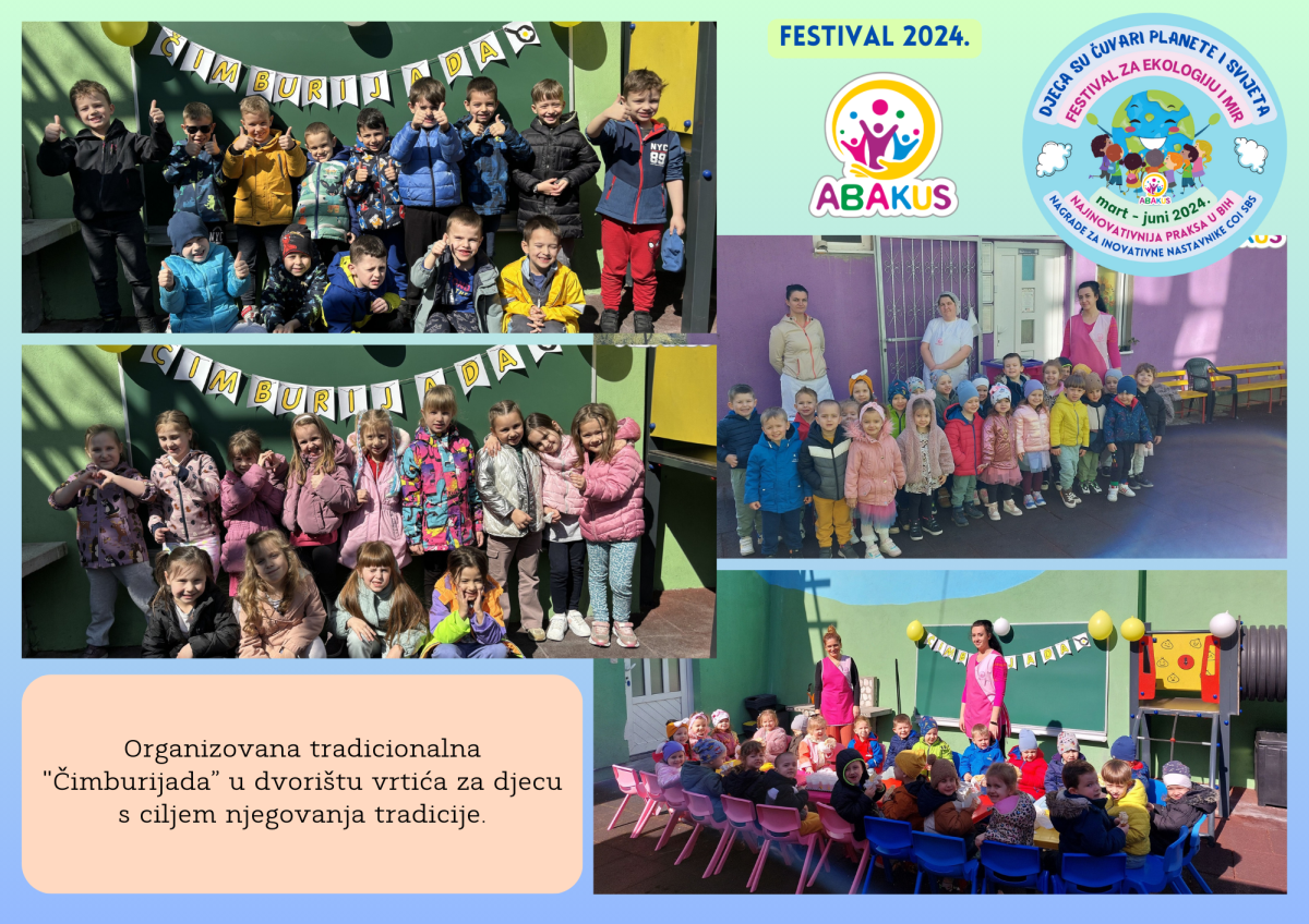 Višestruko nagrađeni Festival za ekologiju i mir “Djeca su čuvari planete i svijeta” se tri mjeseca održava u Zenici u organizaciji Vrtića “Abakus”, Centra za edukaciju, afirmaciju i informisanje “Abakus plus” i Bosanskog narodnog pozorišta u Zenici. Priprema Festivala traje od septembra, edukativni dio je počeo 6.3., a završni scenski i izložbeni dio planiran je 8.6. u vidu izvedbe eko predstave, recitacija, pjesama, plesova, folklornih izvedbi, izložbe igračaka i radova napravljenih reciklažom, te likovnih radova na temu ekologije i mira.