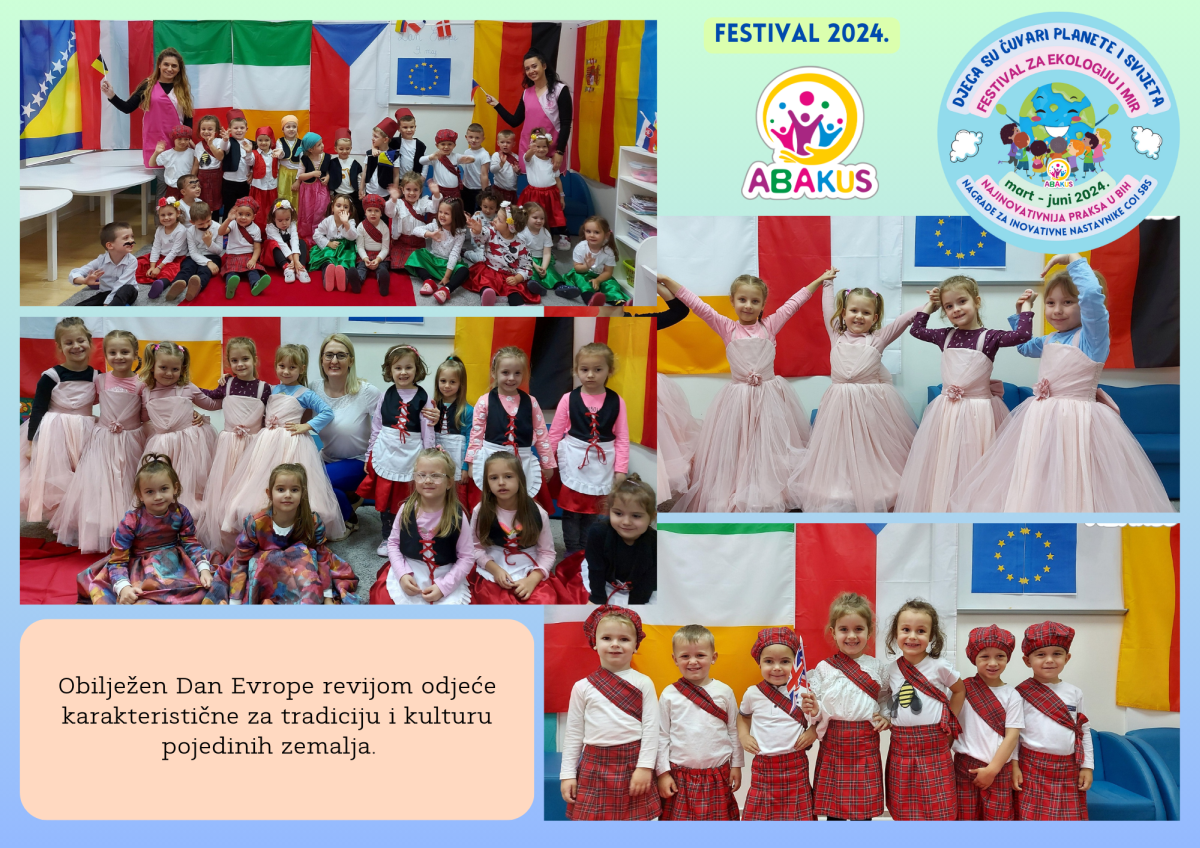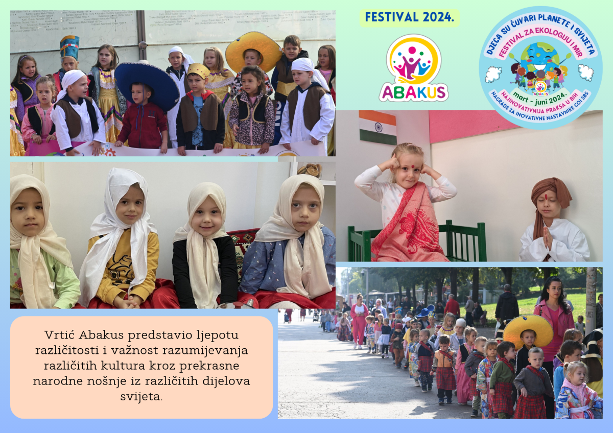 Nakon pripremnog i edukativnog dijela Festivala planiran je završni scenski i izložbeni dio 8.6. u BNP-u. Pored 120 djece vrtića „Abakus“ koja učestvuju u završnoj manifestaciji, ove godine imamo 5 gostujućih prijateljskih ustanova: JU „Dom i porodica“, JU OŠ „Meša Selimović“ Zenica, JU OŠ „Vladimir Nazor“ Zenica, KŠC „Sv. Pavao“ Zenica i JU OŠ „Kiseljak 1“ Bilalovac.