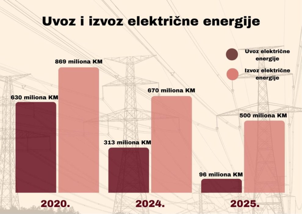Tokom 2025. godine, Bosna i Hercegovina uvezla je najviše električne energije do sada i to u vrijednosti približno 629 miliona maraka, dvostruko više nego 2024. godine.