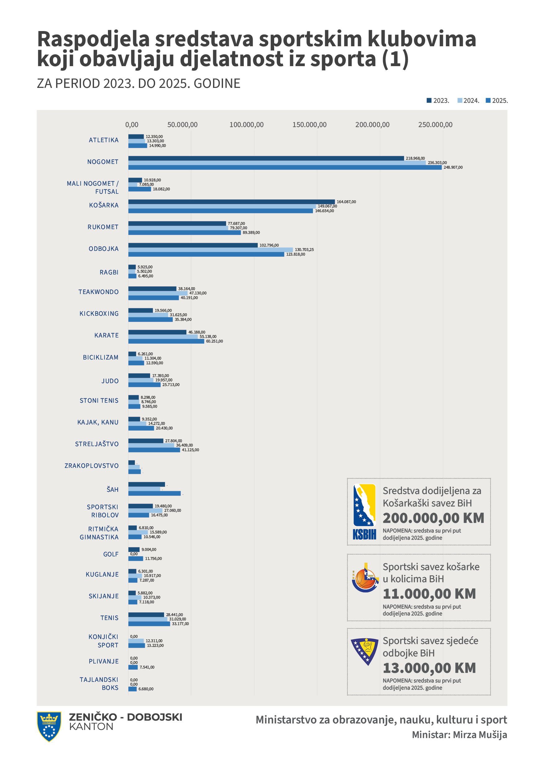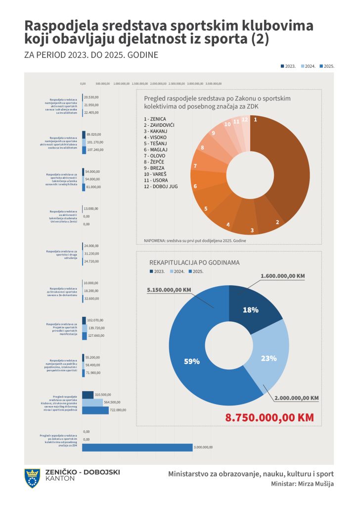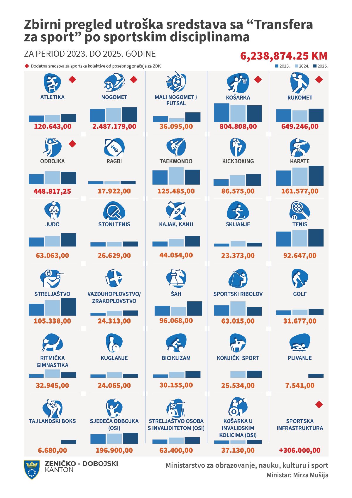 – Zeničko-dobojski kanton je ove godine izdvojio rekordna sredstva za sport, s više od pet miliona konvertibilnih maraka namijenjenih podršci sportistima, sportskim kolektivima i sportskim savezima. Riječ je o najvećem ulaganju u sport u historiji Kantona. Posebno ohrabruje činjenica da je za 2026. godinu planirano povećanje ukupnih izdvajanja na šest miliona konvertibilnih maraka, čime dodatno potvrđujemo trajnu posvećenost institucija ZDK-a sistemskom razvoju i unapređenju sporta na svim nivoima. Kroz planska izdvajanja jasno potvrđujemo opredijeljenost da sport prepoznamo ne samo kao takmičarsku djelatnost, već i kao snažan alat za zdrav razvoj djece i mladih, promociju zdravih stilova života i zajedništva – izjavio je ministar za obrazovanje, nauku, kulturu i sport Zeničko-dobojskog kantona Mirza Mušija.