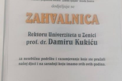 Rektoru i članovima menadžmenta Univerziteta u Zenici uručene zahvalnice – Predstavnici Organizacije porodica šehida i poginulih boraca “ Zlatni ljiljan” Grada Zenice danas su posjetili Univerzitet u Zenici i tom prilikom uručili plaketu i zahvalnicu prof.dr.sc Damiru Kukiću, te zahvalnice prorektorima, dekanima fakulteta i direktoru Studentskog centra za nesebičnu podršku i razumijevanje koju su pružali djeci šehida i poginulih boraca.