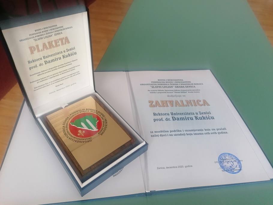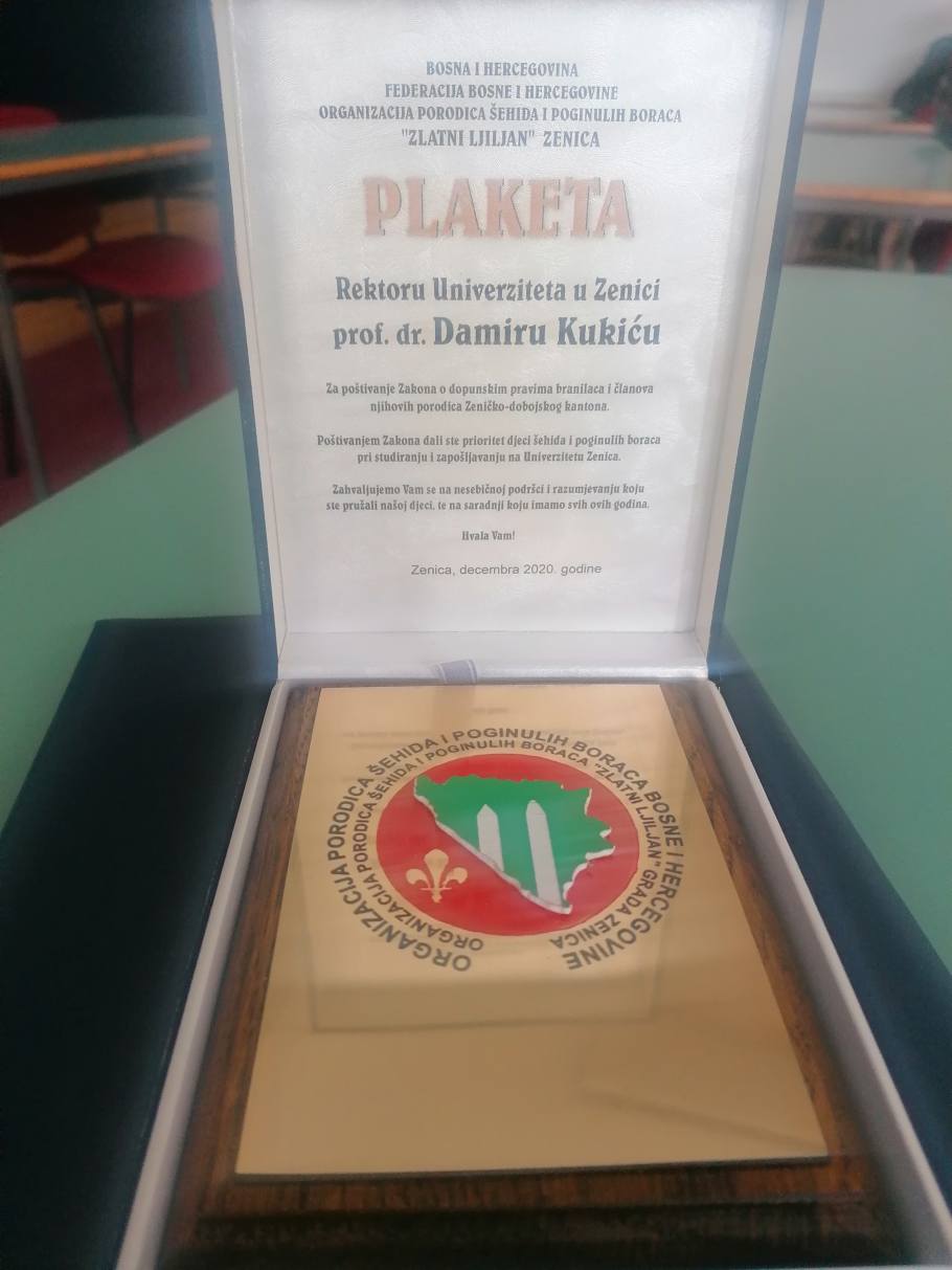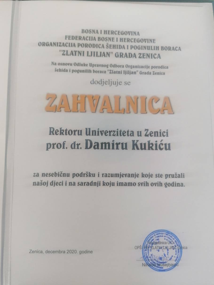 Rektoru i članovima menadžmenta Univerziteta u Zenici uručene zahvalnice – Predstavnici Organizacije porodica šehida i poginulih boraca “ Zlatni ljiljan” Grada Zenice danas su posjetili Univerzitet u Zenici i tom prilikom uručili plaketu i zahvalnicu prof.dr.sc Damiru Kukiću, te zahvalnice prorektorima, dekanima fakulteta i direktoru Studentskog centra za nesebičnu podršku i razumijevanje koju su pružali djeci šehida i poginulih boraca.