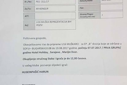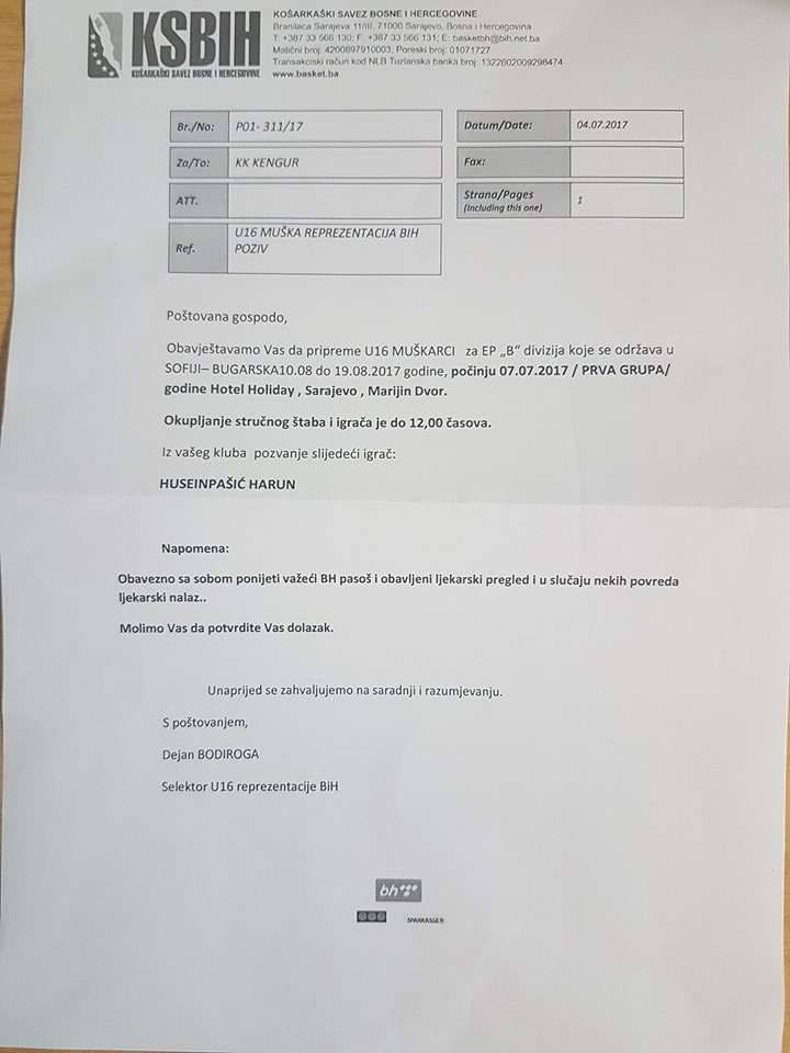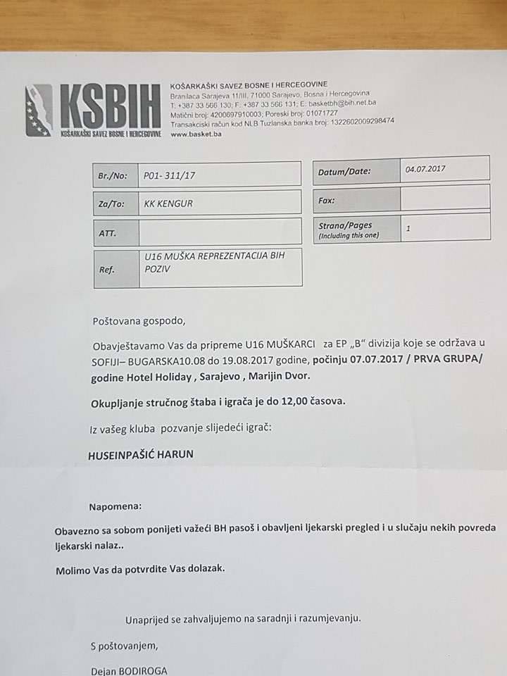 Kapiten kadetske ekipe KK Kengur, najbolji strijelac Lige Mladih BiH i drugi najbolji skakač dobio je poziv selektora Dejana Bodiroge za okupljanje U16 reprezentacije BiH. Okupljanje je zakazano za 7.7.2017. godine (sutra) i nadamo se da će Harun svojim trudom i zalaganjem opravdati poziv koji je dobio. Također, čestitamo trenerima koji su predano radili sa ovim mladićem duže vremena, a njegova upornost i neosporan talent su na kraju došli do izražaja. Čestitamo i njegovim roditeljima koji su odgojili prije svega vrhunskog čovjeka, ali i igrača. Također, ne treba zaboraviti ni saigrače bez kojih ovo ne bi bilo moguće i ovim putem čestitamo svima njima, jer su imali udjela u ovom velikom uspjehu mlade nade zeničke košarke. Nadamo se da će Harun nastaviti vrijedno da radi i niže sportske uspjehe i da će uvijek ostati prije svega dobar čovjek, ali i dobar košarkaš.