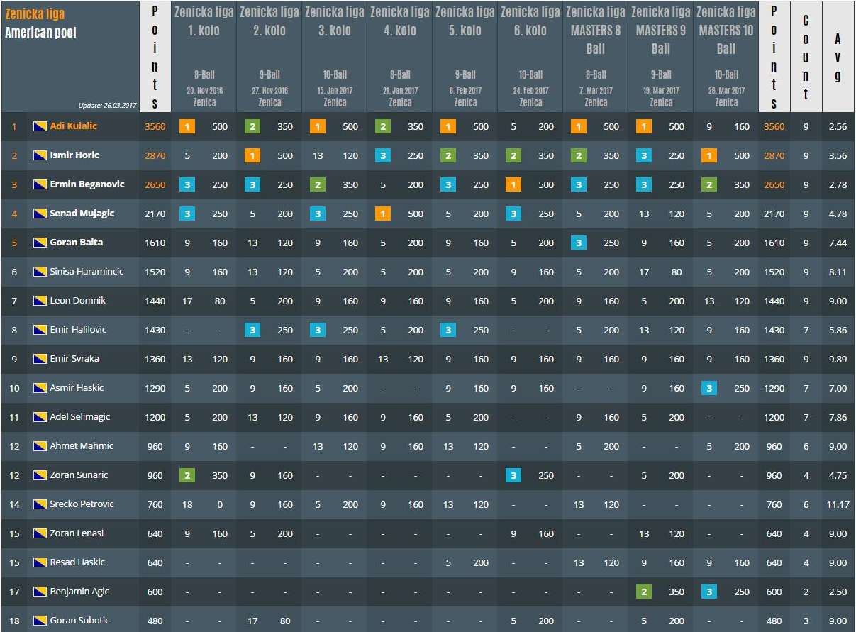 U prostorijama sportskog bilijar kluba Ravens u Zenici održan je posljednji masters za prvaka Zeničke lige u bilijaru. Igrala se disciplina DESETKA u kojoj je najviše uspjeha imao Ismir Horić. Horić je u finalnom meču za titulu u disciplini DESETKA i u direktnom okršaju za drugo mjesto u ukupnom poretku pobjedio Ermina Beganovića neizvjesnim rezultatom 8-7. U polufinalnom meču bio je bolji od Benjamina Agića rezultatom 8-5. Beganović je do finala došao tako što je u polufinalnom meču savladao Asmira Haskića rezultatom 8-6.Ovim mastersom završena je Zenička liga za sezonu 2016/2017, odigrano je 6 redovnih kola i 3 mastersa. Prvak Zeničke lige je Kulalić Adi, ovo je šesta godina zaredom u kojoj Kulalić brani titulu najboljeg bilijariste u Zenici, iza njega na drugom mjestu je Ismir Horić i trećeplasirani Ermin Beganović.